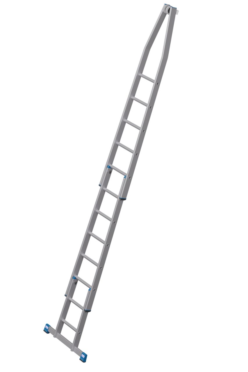 - A létra felső tagja fali vezetőgörgőkkel és kopásálló, puha gumi anyagú érintkező blokkal, ékkivágással, mely házsarkokra és ablakprofilokra helyezhető.
